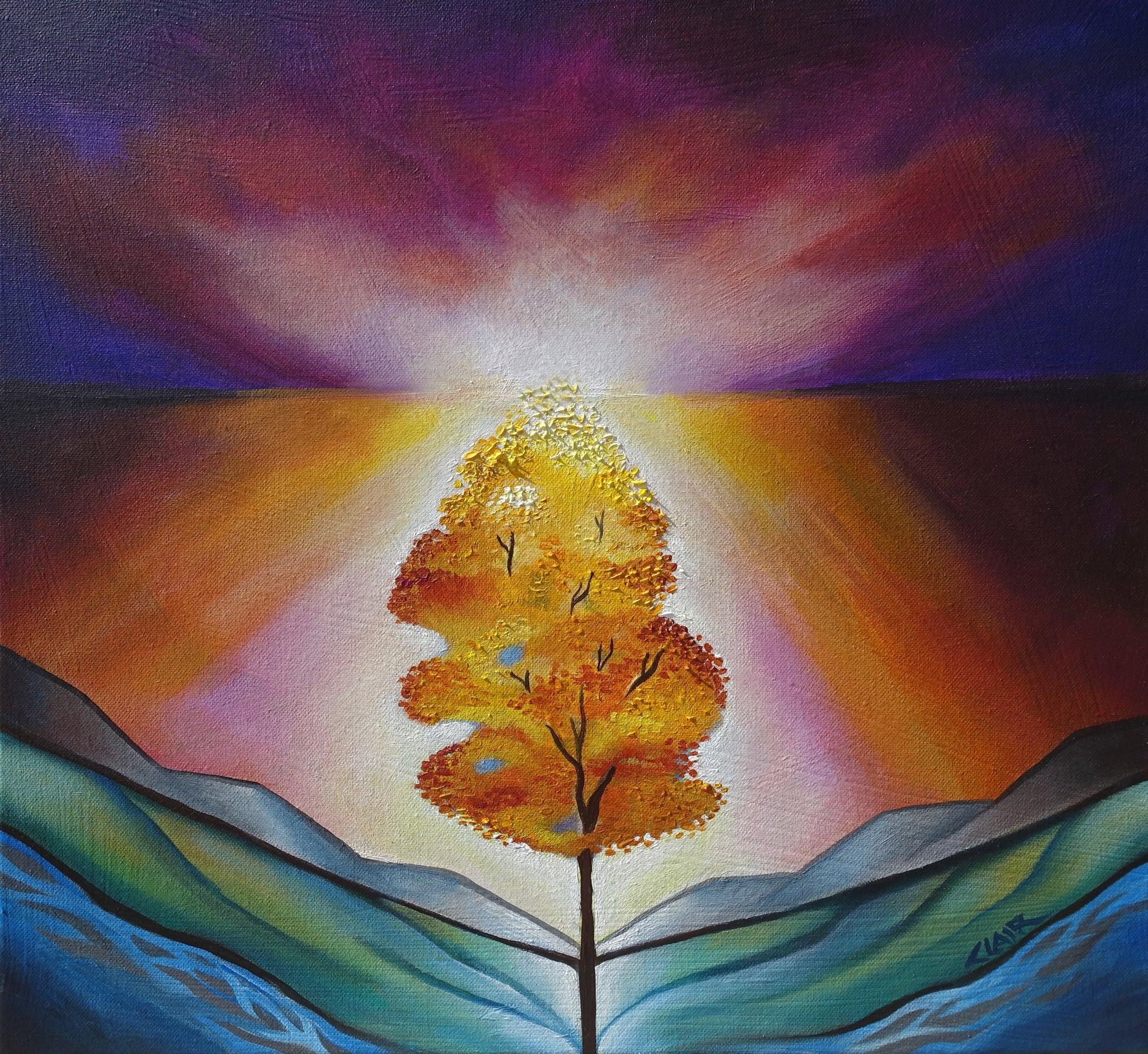 I painted this after all the fires. It symbolizes a rebirth, a growing, a strength from within. A reminder that no matter how hard life can be, you will find your roots you will grow back. Everything is temporary. This tree represents all of us going and growing though life's struggles.. finding the light from within to grow our branches strong to weather each storm life will bring.