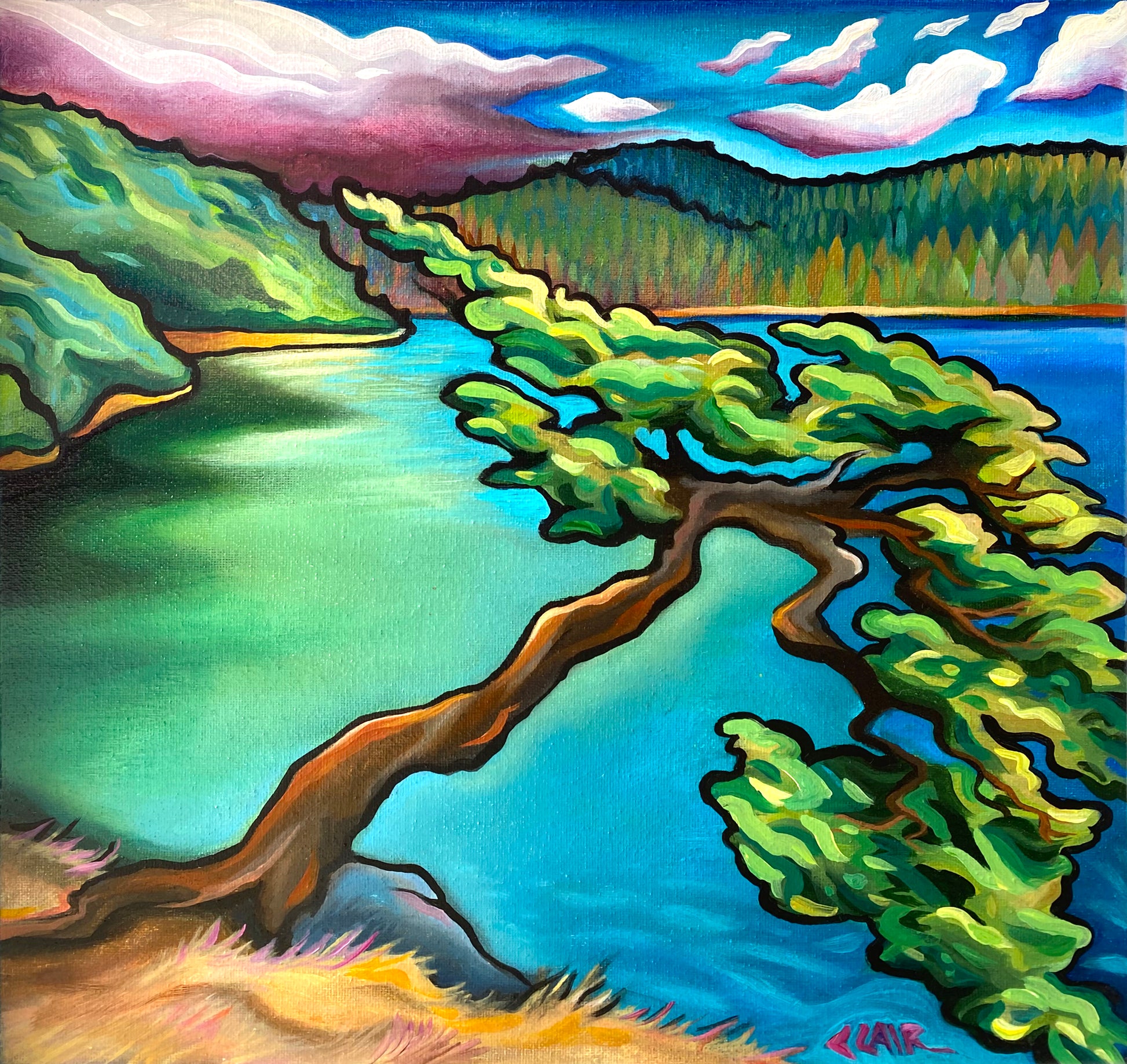 Anyone and everyone who's spent time at cascade lake has seen this great old tree while walking through the forest path. When you come upon this tree, you feel like you are stepping into eternity. Almost like you stumbled upon a piece of living art. The presence of this wise old tree growing resiliently out of a rock on the lake is pretty magical and majestic against the wind swept clouds.. I so loved capturing its grace. I hope this painting gives you happy memories of the lake, and a feeling of strength, growth and new beginnings.