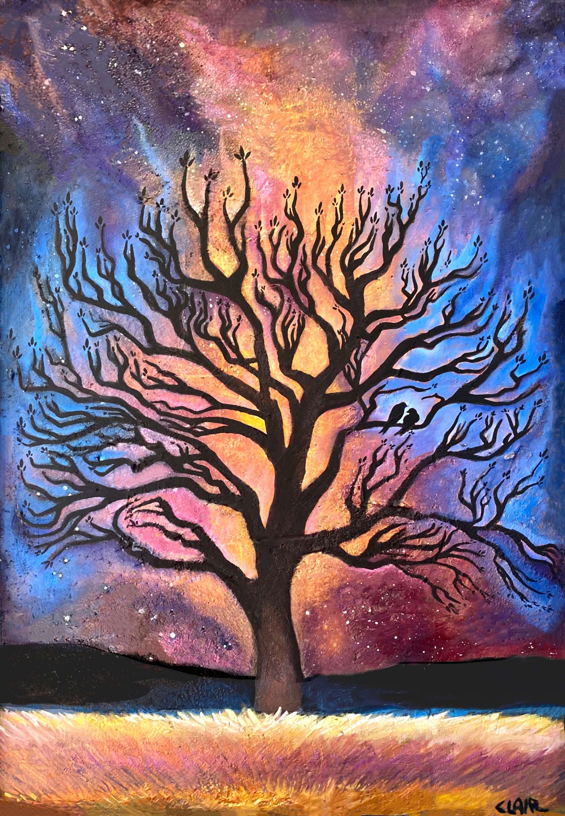 This painting is a symbol of rebirth—a quiet strength that rises from within. The great mother tree reflects all of us, growing through life’s storms. Its glowing light reminds us: no matter how much we’ve lost, we can always grow back.