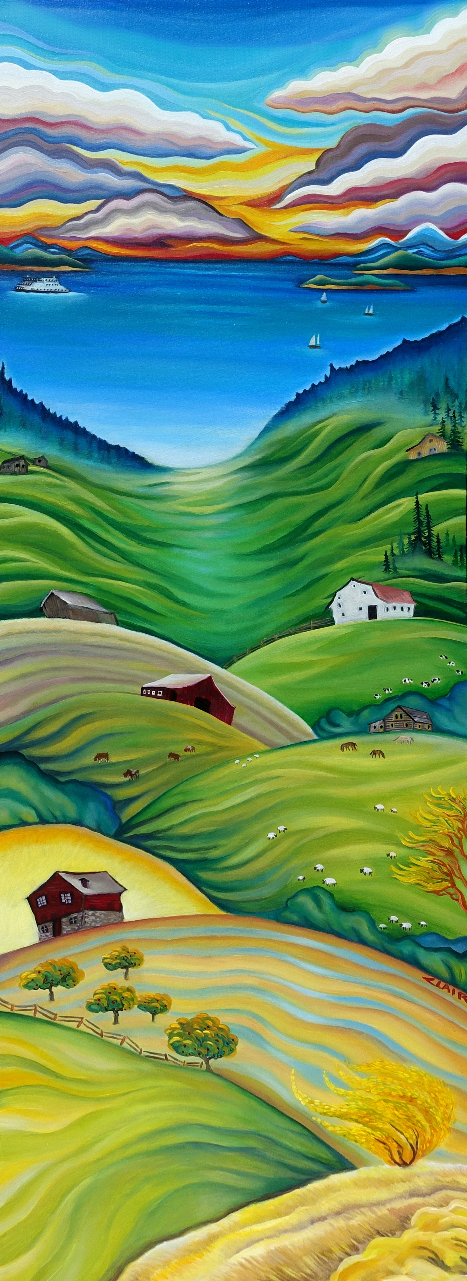 Orcas Life is a beautiful journey up through the meandering hillsides, historical farms, cows, horses, madrona trees, apples, willows, and misty forests reaching all the way up, up to where the Salish seas meet the sky.. Mt Baker in the distance peaking through the San Juan Islands. The ferry off in the distance is the only way to get to this magical little island, and the journey here is part of the magic. I hope this painting always reminds you of this little gem called Orcas Island.