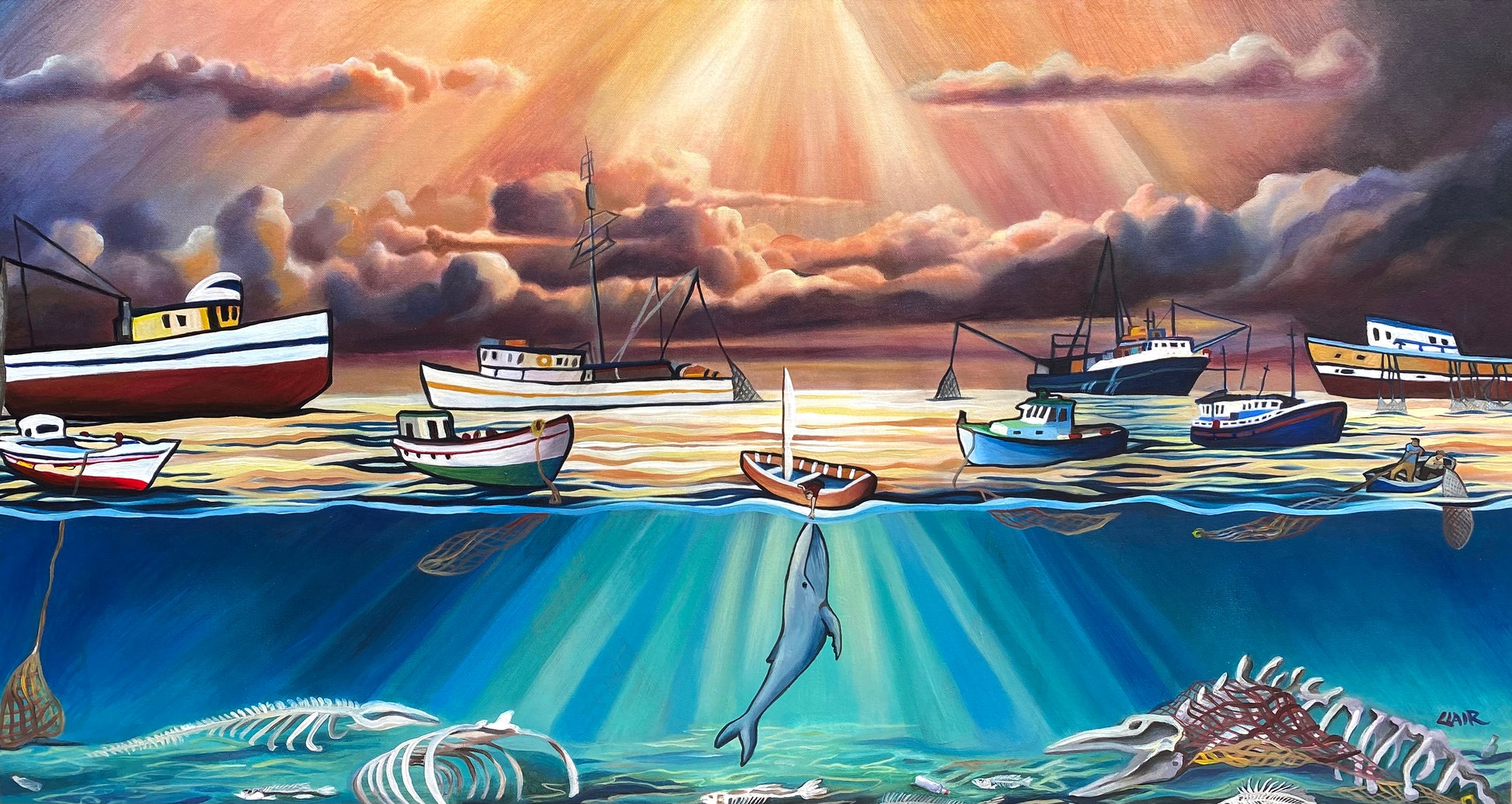 "HOPE" is a painting inspired by the tragedy of whales dying due to overfishing and entanglement in fishing nets. Ironically, I finished this piece on the same day a cruise ship arrived in NYC with a dead whale across its bow. That night, a vivid dream came to me, shaping the vision for this painting.