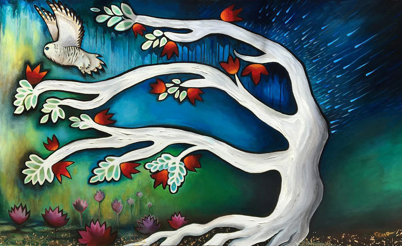 At the heart of the painting, the owl flies as a messenger of wisdom and clarity, guiding us to trust our inner knowing through turbulent times.